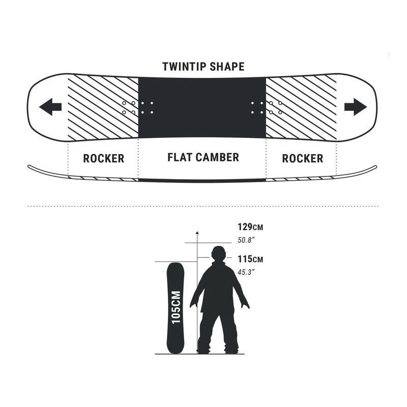 Nous avons développé ce snowboard Decathlon pour les enfants débutants de 1m15 à 1m29 qui recherchent un snowboard facile pour débuter et progresser.Cambre plat avec des spatules avant/arriÚre relevées pour minimiser les fautes de carres et bien passer les plats. Petit rayon de courbe pour plus de maniabilité et pouvoir faire des virages coupés.