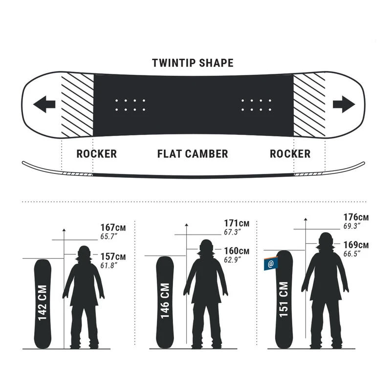 La forme du snowboard (shape) est TwinTip. Les lignes de côte de la planche sont complètement symétriques entre l’avant et l’arrière, offrant une symétrie et un centrage parfaits des caractéristiques de la board pour rider dans les deux sens de la même manière. Un shape TwinTip permet aussi d’être complètement équilibré pour les rotations au sol et en l’air.