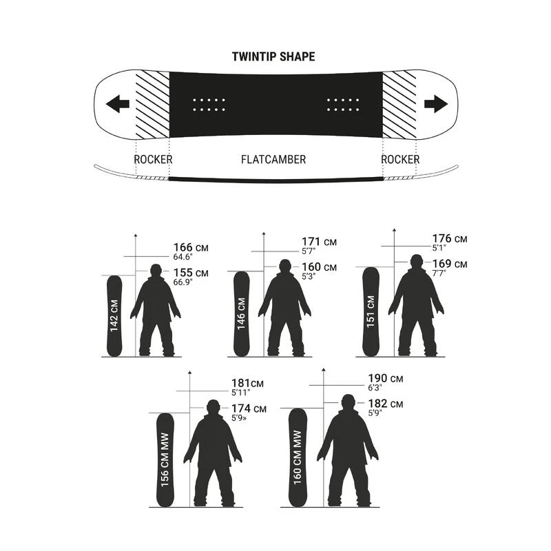 La forme du snowboard (shape) est TwinTip. Les lignes de côte de la planche sont complètement symétriques entre l’avant et l’arrière, offrant une symétrie et un centrage parfaits des caractéristiques de la board pour rider dans les deux sens de la même manière. Un shape TwinTip permet aussi d’être complètement équilibré pour les rotations au sol et en l’air.