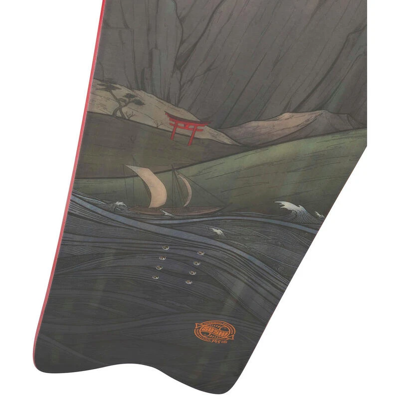 Hommage à la rencontre du snowboard et du surf avec un clin d’œil au style rétro Japow des années 90 le XV Sushi possède une forme directionnelle revisitée et de nouveaux graphiques